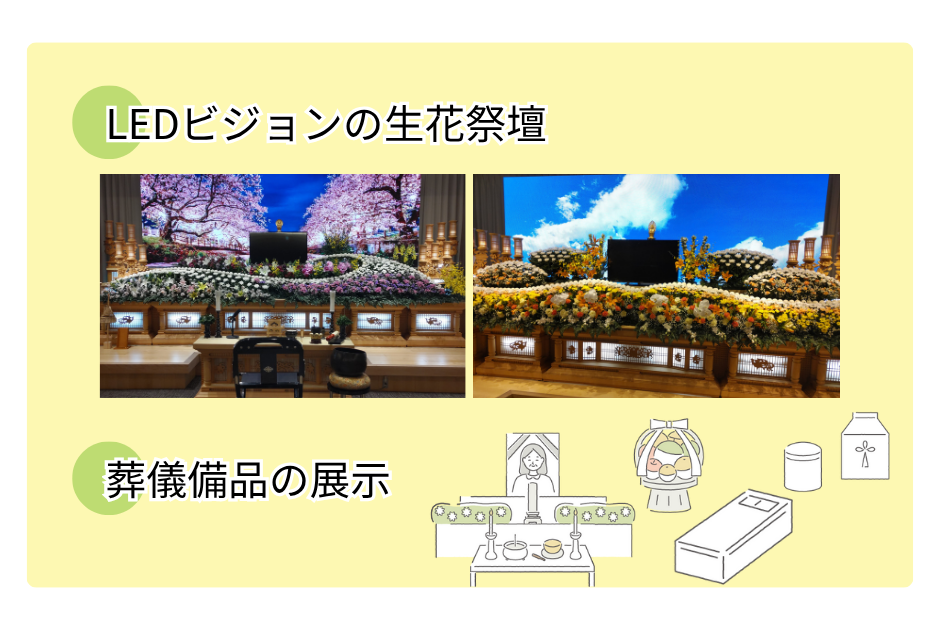 最新のLEDビジョンを活用した、華やかで美しい生花祭壇をご覧いただけます。