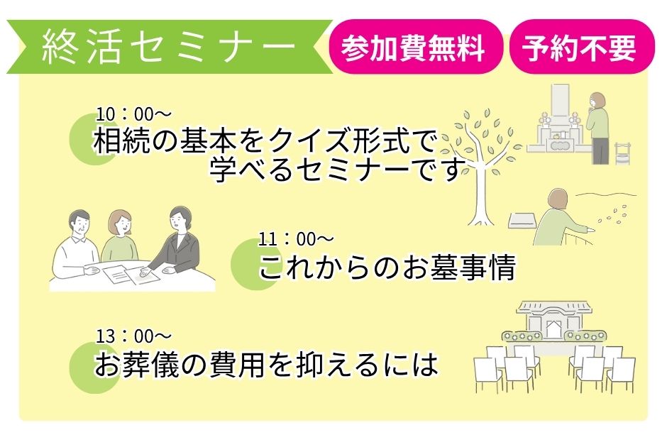 今後の不安や疑問を解消するセミナーや、美味しいグルメ、葬儀備品等の展示など、見どころ満載でお届けします。
